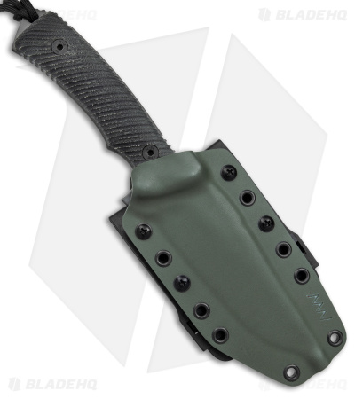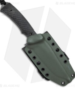 - Green kydex sheath set up for vertical belt carry or MOLLE webbing.