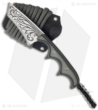 The Alan Folts Minimalist is a compact carry neck knife with notably deep finger grooves that provide excellent grip, comfort and safety. This custom titanium knife features a hand engraved and colored blade along with contoured black/gray G10 scales. The recurved tanto blade is chisel ground with a carbide edge. Includes lanyard, Kydex sheath and neck cord. Pictured above is the actual knife for sale.
