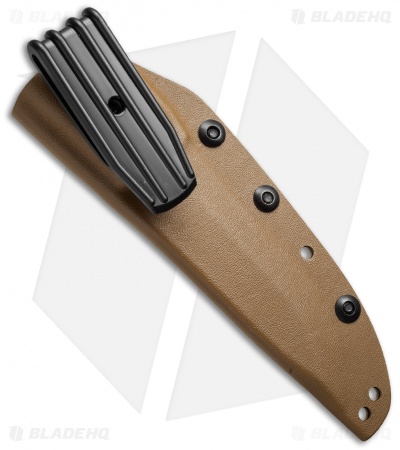 This formed tan Kydex sheath from Armory Plastics fits TOPS Knives BOB Fieldcraft fixed blade models with a Micarta handle*. It includes their AB Nylon clip for belt carry.