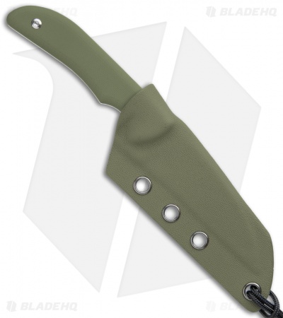 - Black kydex sheath with a paracord loop for neck carry.