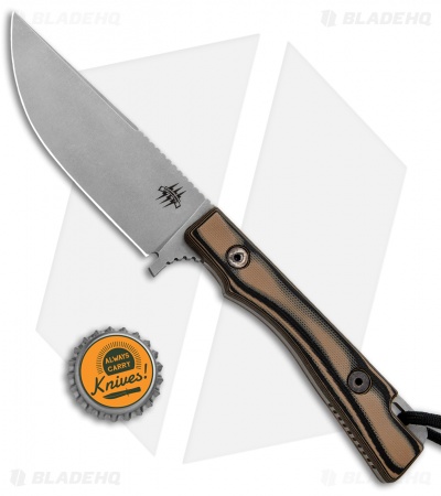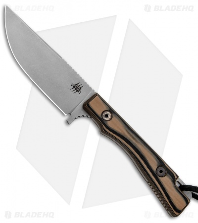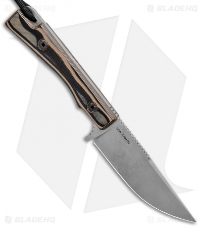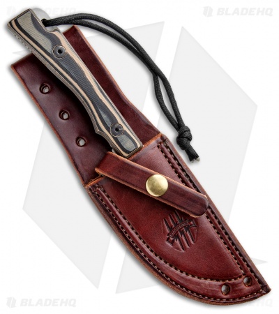 Take on you next hunting challenge with the Caribou Mountain Skinner from Attleboro Knives. This model is outfitted with black and tan layered G-10 handle scales and a satin finished skinner blade. Item includes a Grizzly Brown premium leather sheath.