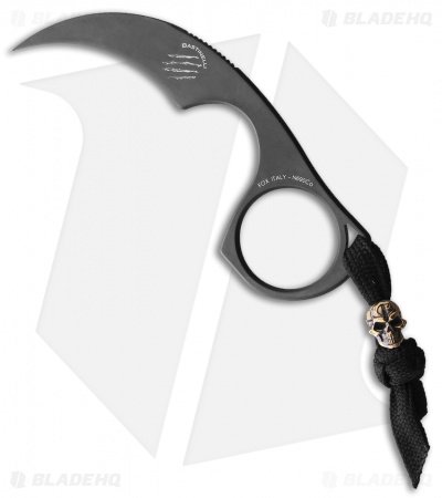 This Diagnostic Karambit from Bastinelli Creations has a unique design with the finger ring and choil under the blade. The steel is PVD coated stainless N690Co and comes with a black Kydex neck sheath. There is an embellished black lanyard attached to the base of this knife with a bronze finished skull bead.