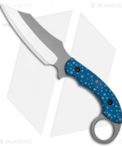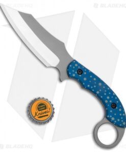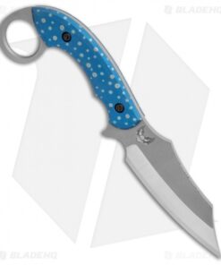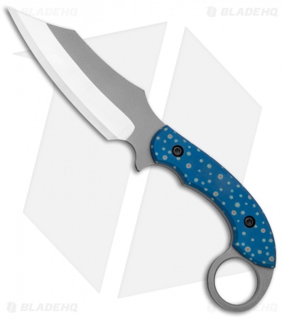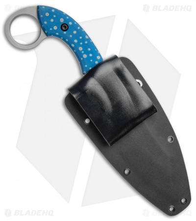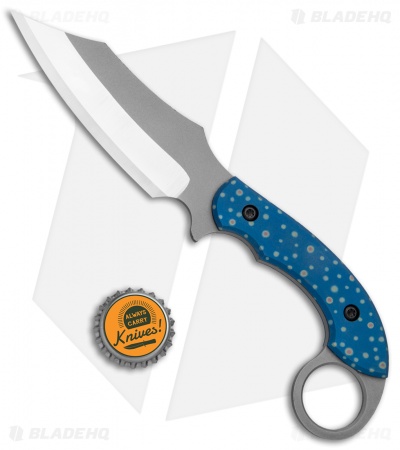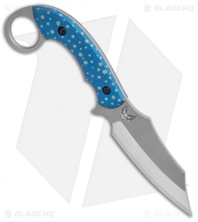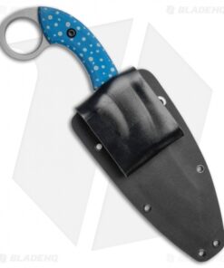 This custom Bat Cave Blades Karambat #020 has a CPM-S30V blade with blue anodized titanium handle scales with trout, paintbrush embellished speckles. It has a classic Karambit style handle, and a Kydex sheath. With purchase of this knife comes a certificate of authenticity.