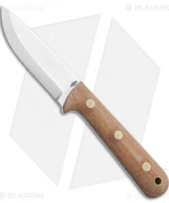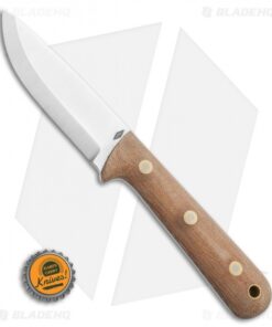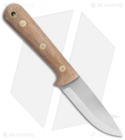 This Woodsman Pro model features a natural micarta handle and a satin finished blade with a scandi grind.