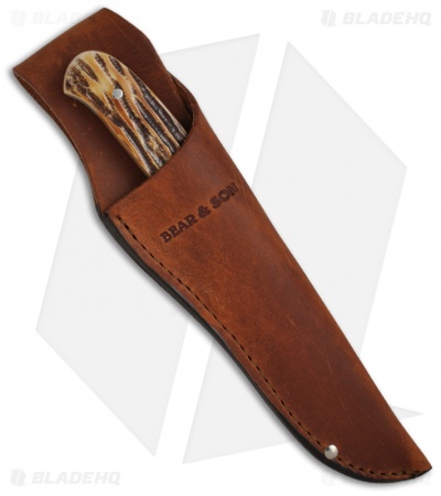 This 8 1/8″ Pro Skinner fixed blade knife features a Damascus steel blade and genuine India Stag Bone handle scales. The nickel silver bolsters adds a great touch to a classy, well-made knife. The included leather sheath has a belt loop for carry.