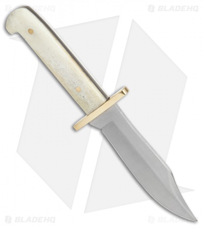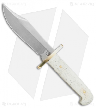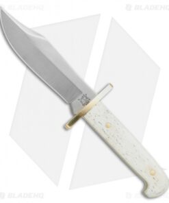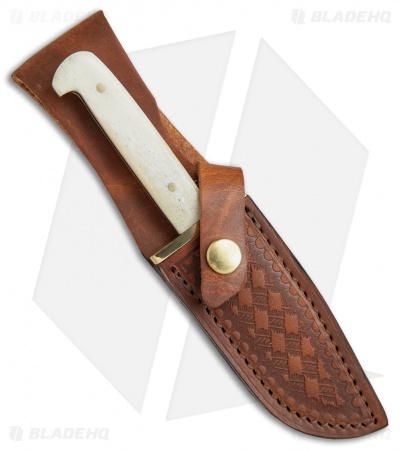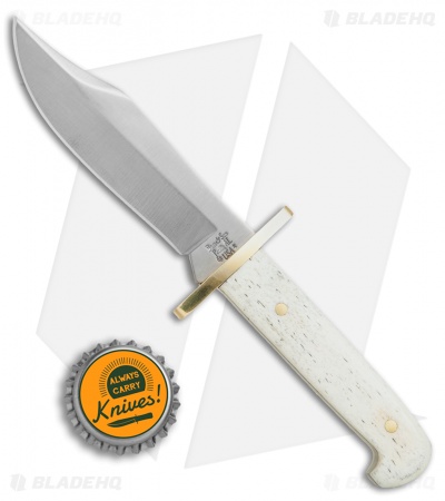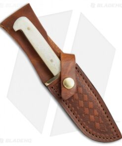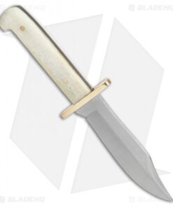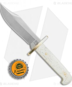 The Bear and Son Baby Bowie fixed blade offers the rugged USA-made quality Bear is known for in a compact EDC size. This mini hunting knife is equipped with a plain bowie blade and white bone handle scales. A brass guard and pins add a sophisticated touch to the design. Item includes an embossed leather belt sheath.