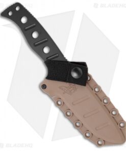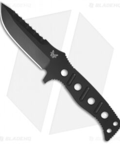This Benchmade Adamas fixed blade combat knife was designed by Shane Sibert. This Benchmade knife black finished D2 steel drop point blade has a plain cutting edge and jimping on the spine. The handle is skeletonized with optimally positioned grooves. The Fixed Blade Adamas knife also comes with a tan molded sheath with secondary locking strap and tension screw for secure storage and custom tuned deployment.