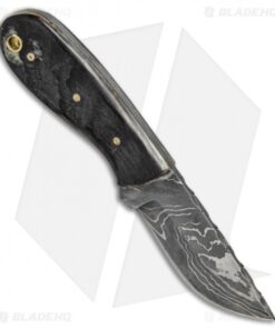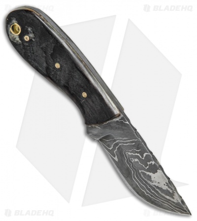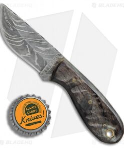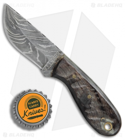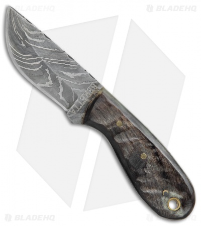 This Texan fixed blade model is outfitted with a damascus blade and dark wood handle scales.