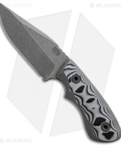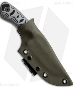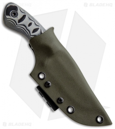 The Ridgeback Custom knife is a small belt knife perfect for everyday chores. It is made from N690 stainless steel and features an acid wash finish. The handle is made from sculpted black/white layered G-10. Each Kydex sheath is custom made as the texturing on each handle is unique to every knife.