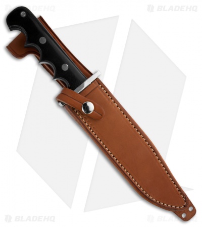 The Model 14 Halo Attack is designed for survival. The D2 steel clip point blade is bigger than the Classic Model 1-7. The Halo Attack Model 14 features a thick double quillion guard and black polished canvas Micarta handle. The finger grooves on the handle creates a secure grip. The tang utilizes a mortise type construction for superb strength and comfort. Includes leather sheath.