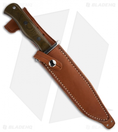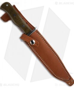 The Model 14 Halo Attack is designed for survival. The A2 steel clip point blade is bigger than the Classic Model 1-7. The Halo Attack Model 14 features a thick double quillion guard and “border patrol” style handle with polished green canvas Micarta handle. The tang utilizes a mortise type construction for superb strength and comfort. Includes leather sheath.