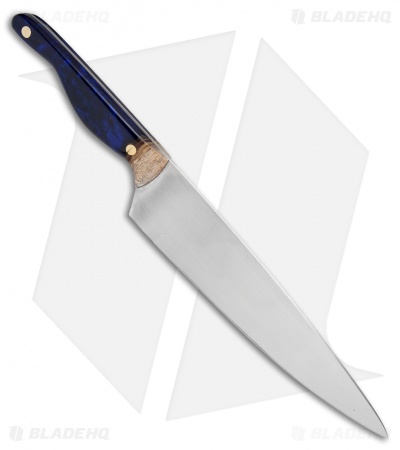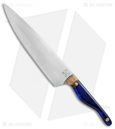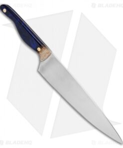 The Mule from Blue Collar Blades is a large 13″ chef knife with a uniquely ergonomic handle. Blue Collar Blade worked with cooking professionals to design a handle that performs flawlessly in the kitchen with a sleek style that’s all it’s own. It has a blade made from AEB-L stainless steel for a tough blade with maximized edge retention. The handle showcases impressive Hawaiian Koa wood sourced from RuhsWoodshop with a dramatic blue resin infused grip. Solid brass pins complete the outstanding design. Blue Collar Blades specialize in handcrafted kitchen tools that elevate the cooking experience.
