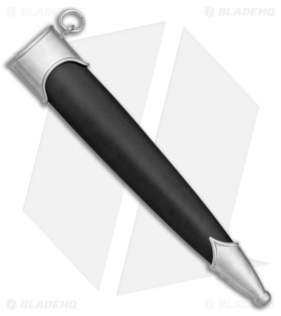 A popular secondary weapon of Swiss pikemen of the 15th and 16th centuries, the characteristic crescent shaped pommel and crossguard has been upgraded from the historic iron construction to stainless steel. The 8.625″ high carbon, satin finished blade is marked with an early 20th century Boker logo. The contoured cherry handle is paired a traditional Swiss metal sheath.