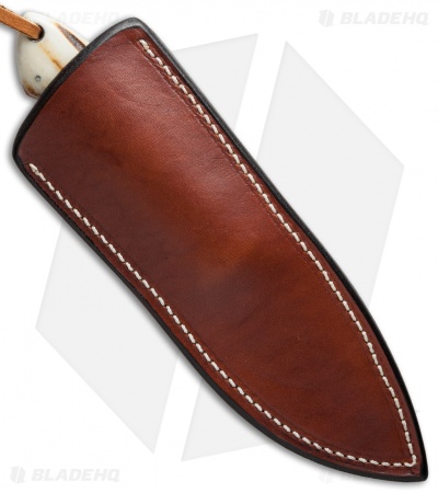 Handmade by Brad Zinker, this Gut Hook Skinner knife is exceptional. It has a tapered full-tang CPM-154 steel blade, stainless bolster guard, and genuine stag scales. Includes leather lanyard and fitted sheath for belt carry.