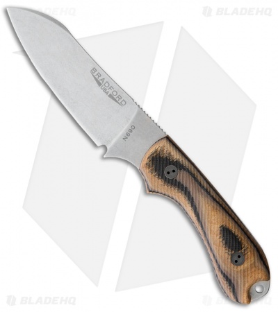 The Guardian3 is a relatively compact fixed blade that is designed to handle the work load that might typically fall upon a heavy duty everyday folder. Bradford Knives uses Bohler N690 steel with a double temper and cryo treatment for exceptional blade characteristics. 3D G-wood scales offer a comfortable grip without being abrasive. Each knife includes a premium leather sheath with belt loop and plastic blade insert.