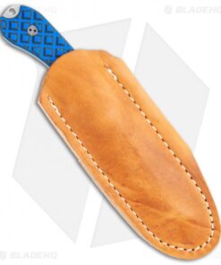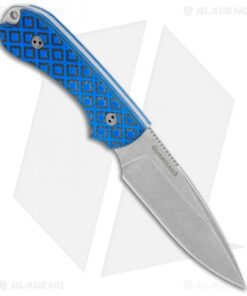 This knife has a stonewash blade with a false edge (swedge) and black/blue G-10 scales.