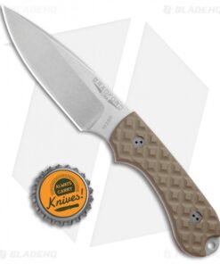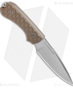 This knife has a stonewash blade with a false edge (swedge) and coyote brown G-10 scales.