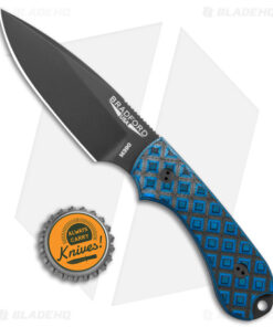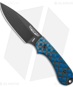 - Black drop point blade made from Bohler M390 steel with a false edge.