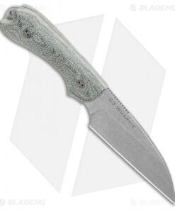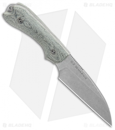 - Wharncliffe blade with a stonewash finish made of Bohler M390 steel with spinal jimping.