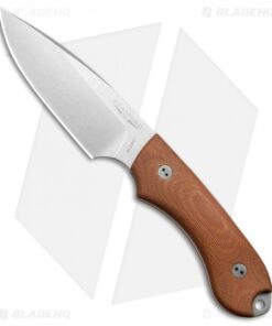 This knife has a Bohler M390 steel blade with a false edge (swedge) and stonewashed finish. The handle is fitted with 3D natural Micarta scales.