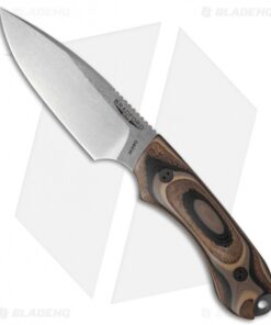 This knife has a Bohler M390 steel blade with a false edge (swedge) and stonewash finish. G-Wood scales.