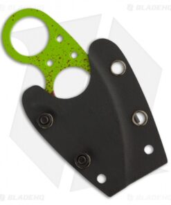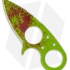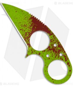 This Silent Soldier features a bright Zombie Green Cerakote finished blade with random blood splatter! The Wharncliffe style blade has a 2.31″ cutting edge and the handle has a double hole design with a finger groove and safety finger guard incorporated in the design for superior grip. This is a superb design for neck carry and includes a formed Kydex sheath with clip and ball chain.