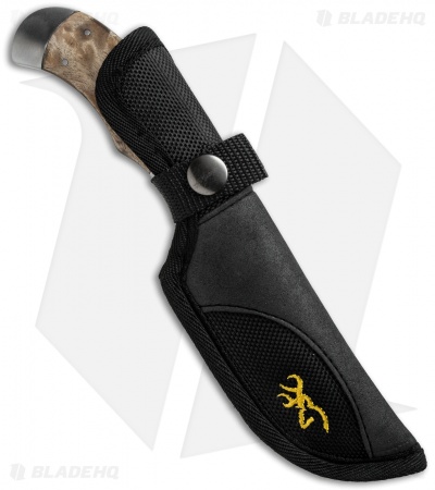 Browning has an established line of hunting knives, designed by renowned knifemaker Russ Kommer, to fit the needs of every hunter. The Pursuit fixed blade is designed for all things hunting related and it looks good in the process. The drop point blade has large hollow grinds and a patch of jimping along the spine for added thumb control on the fine cuts. Full-tang construction with contoured stabilized burl wood scales and stainless steel bolsters. The Pursuit includes a nylon sheath with snap closure and belt loop.