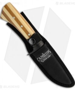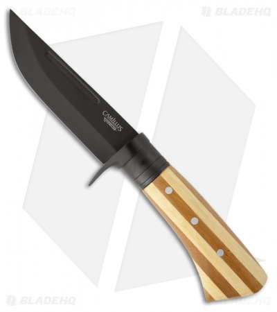 The 9.75″ Carbonitride Titanium Fixed Blade from Camillus features a two-tone bamboo handle. The black coated AUS-8 steel blade has a standard shape with hollow grinds. This fixed blade is ready for carry with the included nylon sheath.