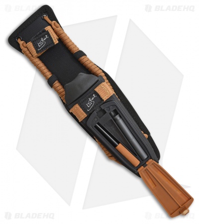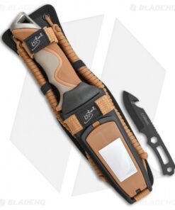 - Comes with a nylon belt sheath, 12′ of paracord, trimming knife, sharpener, fire starter, whistle, flashlight, and a signal mirror.