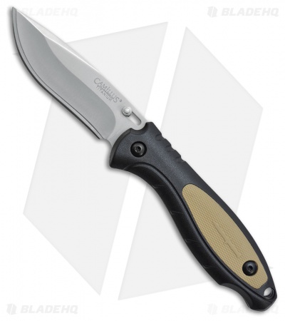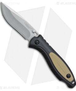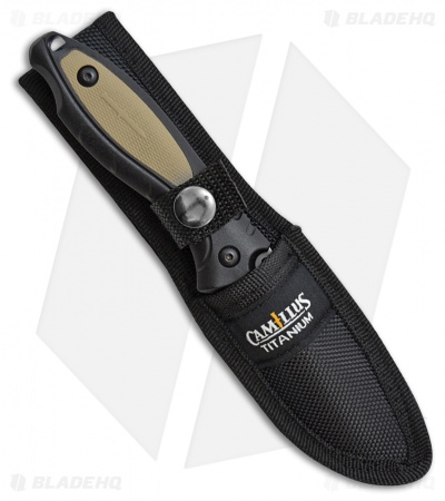 - Black FRN handle with tan rubber inserts and a lanyard hole.