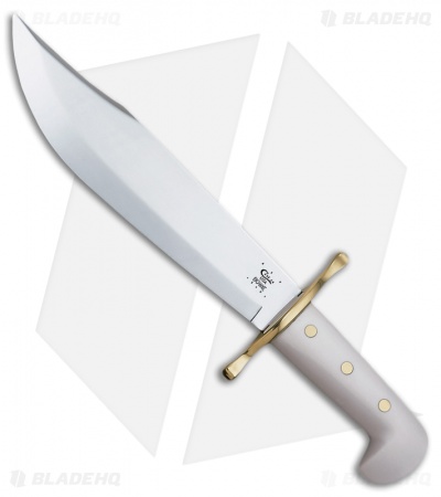 This Large Presentation Hunter Bowie knife features a classic brass guard, a white polymer handle, and a polished stainless steel Bowie blade. The handle has a large pommel and three decorative brass pins. This classic Case Bowie is designed to withstand hard use in the field, but makes an elegant and striking piece to add to any knife collection. Includes a finely stitched brown leather sheath with basket weave embossing and a 2″ belt loop. (BOWIE SS)