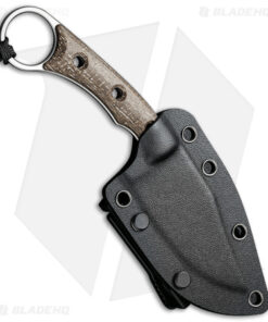 - Brown burlap micarta handle with a ring on the end of it.