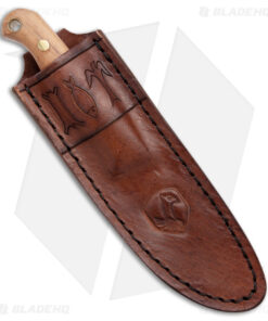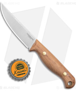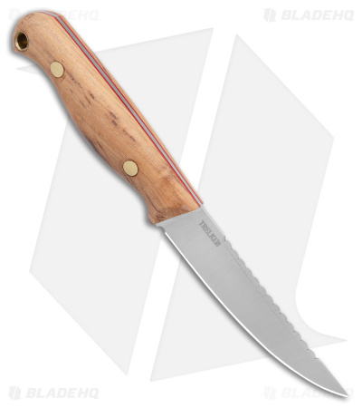 The Trelken Knife from Condor is a small fixed blade knife with hickory handles and brass pins. The blade is made from 420 HC and sports a section of serration-like teeth along the spine. It includes a leather belt sheath for convenient carry.