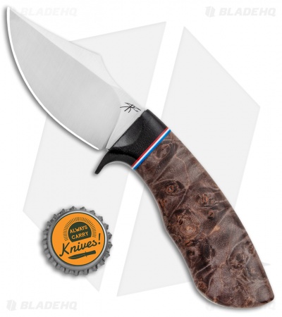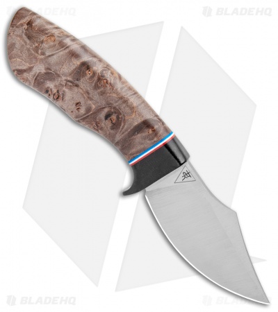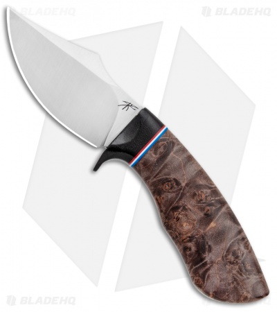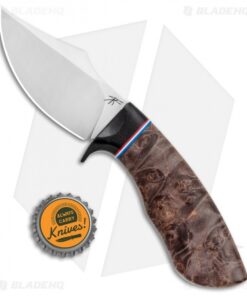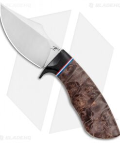This Dark Knight Skinner boasts a Dark Maple Burl handle with a black micarta guard and a red, white, and blue spacer.
