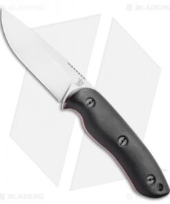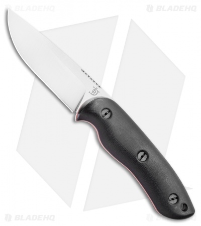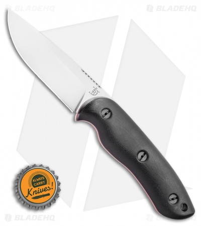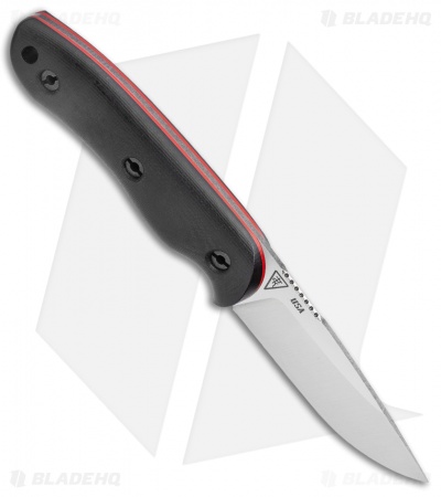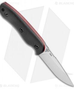 This Bushy fixed blade knife is outfitted with black micarta handles with red liners. Its blade has a satin finish.