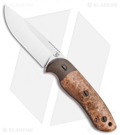 This Bushy fixed blade knife is outfitted with green micarta and dark black ash burl handles with orange liners. Its blade has a satin finish.