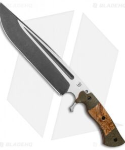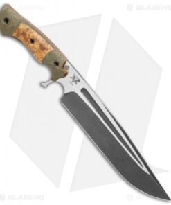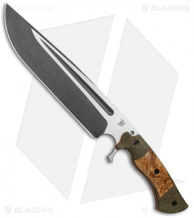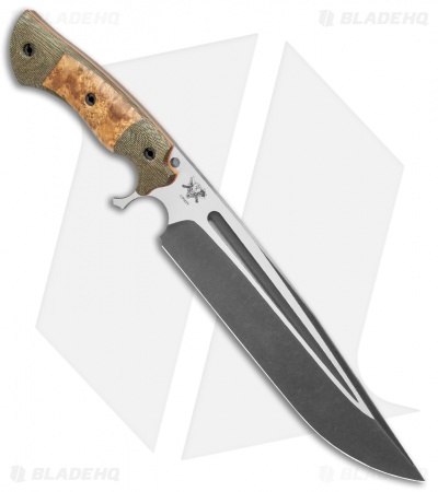This Cave Bear fixed blade knife comes equipped with black ash burl, green micarta and orange G-10 liners. Its blade has a two-tone acid etched finish.
