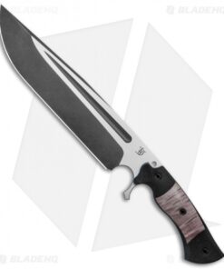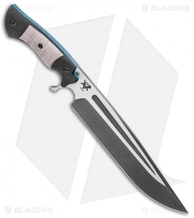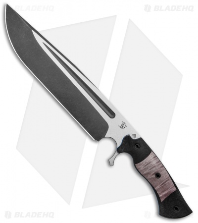 This Cave Bear fixed blade knife comes equipped with black curly maple, black micarta and blue G-10 liners. Its blade has a two-tone acid etched finish.