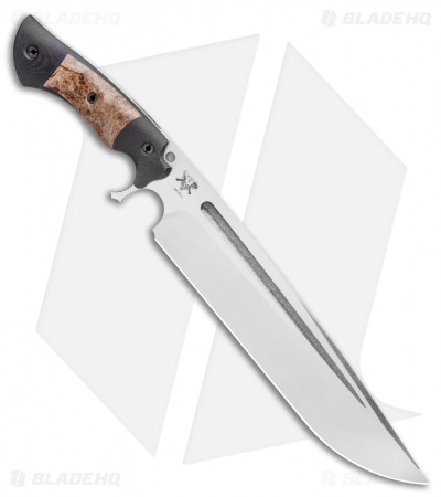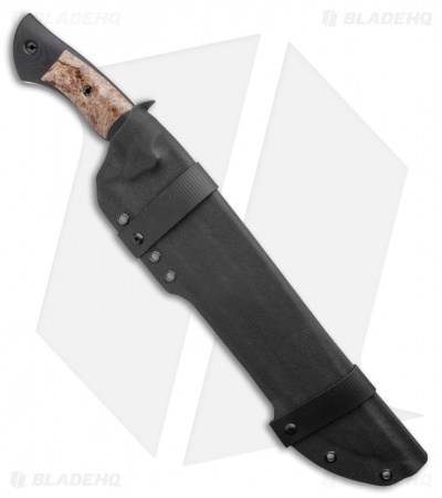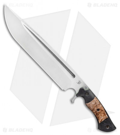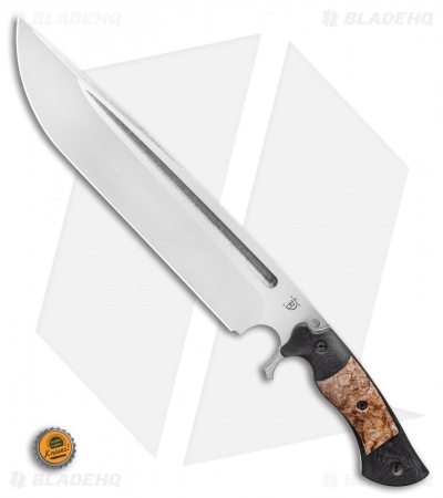 The Dark Timber Knives Devil’s Horn is one intimidating piece. This heavy duty blade gives off quite a menacing vibe as you unsheathe it with robust action. The 11.75″ drop point blade has a two-tone satin and stonewash finish with a well-defined blood groove. Its weight is nicely dispersed throughout the knife on account of the full tang construction. The handle is made with strong micarta and ash burl wood with stainless steel hardware.