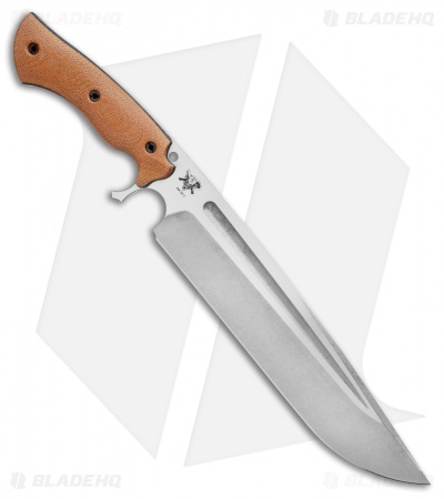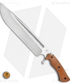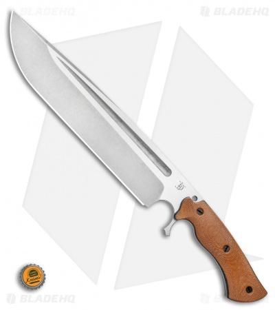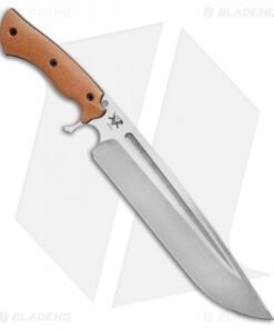The Dark Timber Knives Devil’s Horn is one intimidating piece. This heavy duty blade gives off quite a menacing vibe as you unsheathe it with robust action. The 11.75″ drop point blade has a two-tone satin and stonewash finish with a well-defined blood groove. Its weight is nicely dispersed throughout the knife on account of the full tang construction. The handle is made with strong micarta and stainless steel hardware.