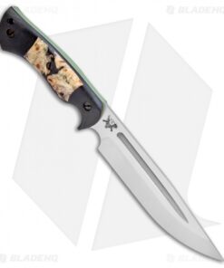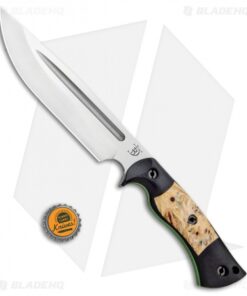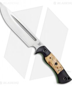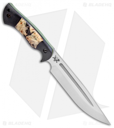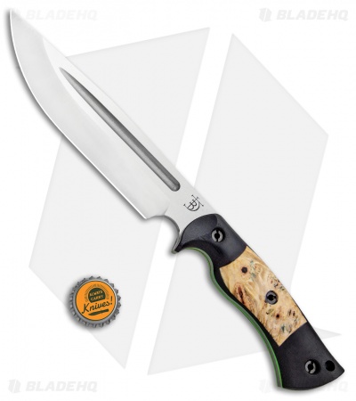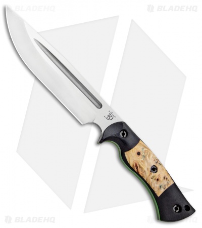 This Honey Badger fixed blade is outfitted with Black Micarta scales with buckeye burl inlays over green G-10 liners. Its blade sports a satin finish.