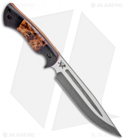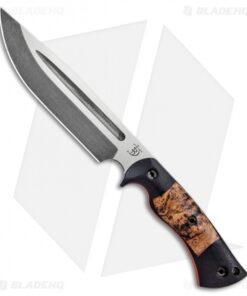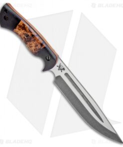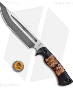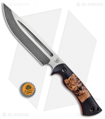 This Honey Badger fixed blade is outfitted with black micarta scales with black ash burl inlays over orange G-10 liners. Its blade sports an acid stonewash finish.