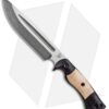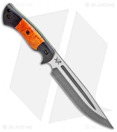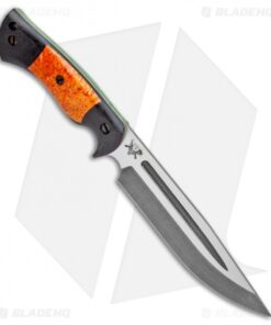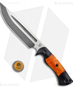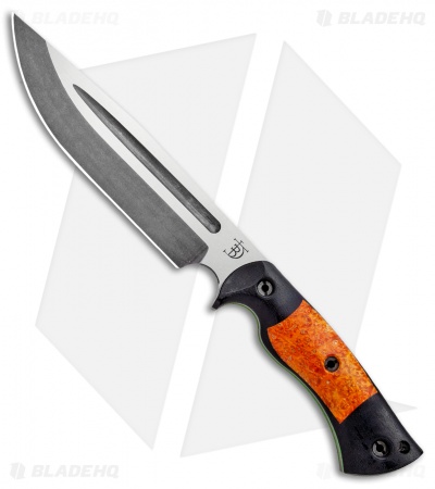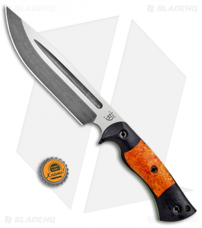 This Honey Badger fixed blade is outfitted with black micarta scales with orange box elder inlays over G-10 liners. Its blade sports an acid stonewash finish.