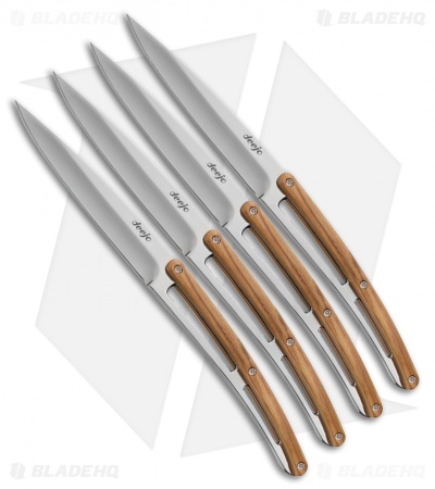 This knife set includes four 9-inch steak knives made from solid stainless steel in a mirror finish. The handles have been fitted with beautiful Olive wood slabs for a sure grip.