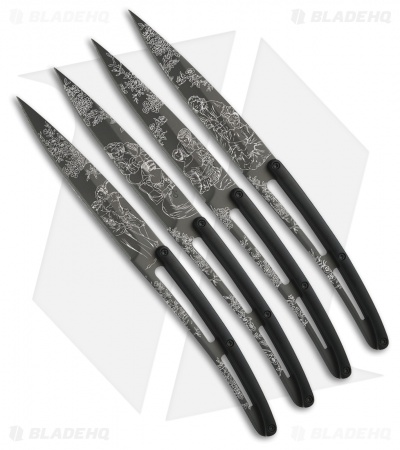 - Full tang stainless steel, drop point blades have gray finishes with “Toile de Jouy” tattoo artwork and a fully serrated edge.