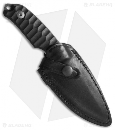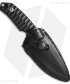 This Inazuma fixed blade has a matte PVD black coated Niolox steel blade with full-tang construction and carved G-10 scales. Its pommel extends past the scales, offering a hole for lanyard attachment. The handle on the Inazuma is relatively short, but the index finger groove and guard provide a high level of safety, even during hard use, to ensure your hand stays where it should. The Inazuma includes a fine leather sheath with a horizontal belt loop. Manufactured by LionSteel in Italy.