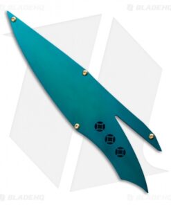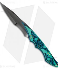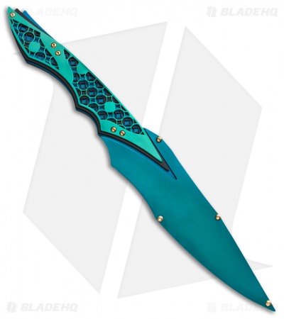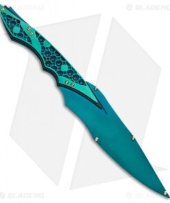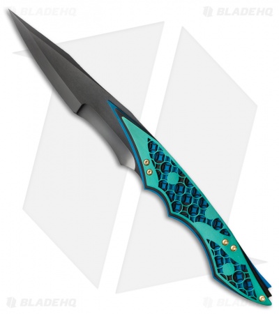 The SAN fixed blade is the creation of Dew Hara, son of the widely known and highly regarded knifemaker Koji Hara. This knife is an absolutely stunning work of art. It has a DLC finished ATS-34 steel full-tang blade with a three layer anodized aluminum handle. The two outermost layers feature a decorative pattern that is accented by a blue anodized base layer. A matching green anodized aluminum sheath is included. This is a singular knife and a great collection piece. Direct from maker.