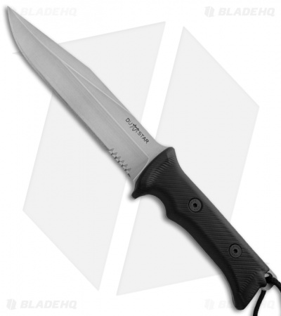 This DUSTAR Knives Dimona has a black handle and a gray blade with a partially serrated edge.