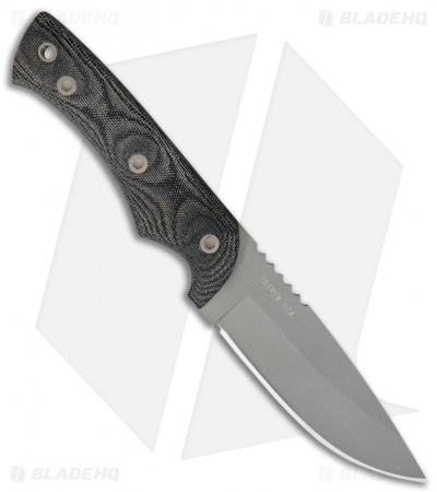 The EnTrek Otter is a sturdy fixed blade equipped with a 440C stainless steel blade and comfortable Micarta handle scales. This model has a gray finished blade and black Micarta scales. Includes a black Kydex belth sheath.