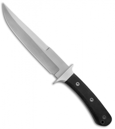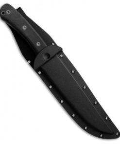 The handle uses black canvas micarta. Black Canvas micarta not only looks good but it also provides a very good gripping surface as well as being impervious to heat, cold, oil, water and other things that would destroy most handle materials. The sheath is made from black Kydex and features a belt clip, and black eyelets so you can lash the sheath to your gear if that is your desire.